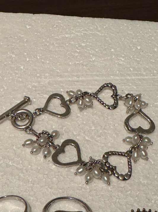 Vintage Lori Bonn Sterling Silver Freshwater Pearl Heart Link Toggle Bracelet 7.5