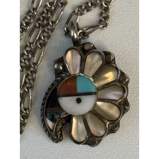 Ruth Lonjose Zuni Sterling Silver Sunface Pendant Necklace Turquoise Coral Inlay
