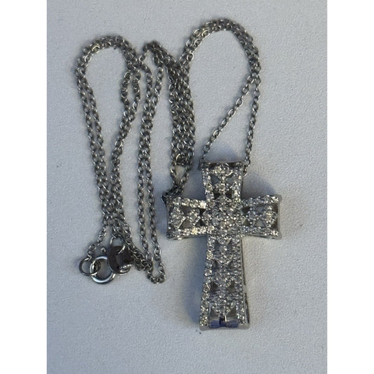 Vintage Sterling Silver 925 CZ Pave Religious Cross Pendant Necklace 18"