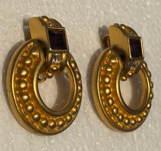 Vintage Givenchy Clip-On Earrings | 1980s Gold Tone Door Knocker | Faux Amethyst & Rhinestone | Signed Designer Statement Jewelry