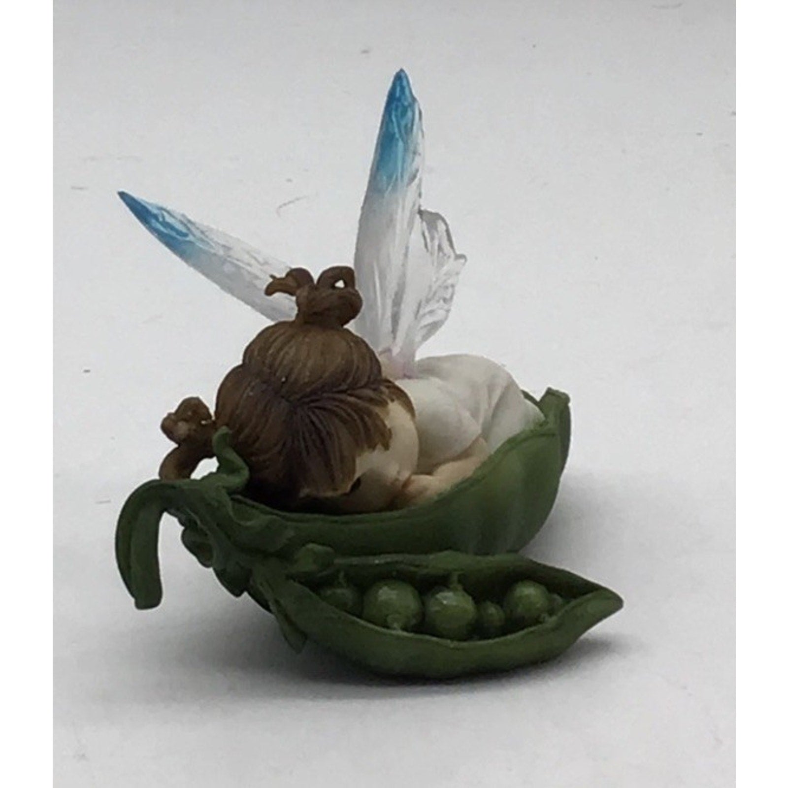 The My Little Kitchen Fairies "My Little Sweet Pea" figurine captures the whimsy of a fairy resting in a pea pod. This collectible piece, complete with original box, adds charm to any space with its intricate design and delicate details.