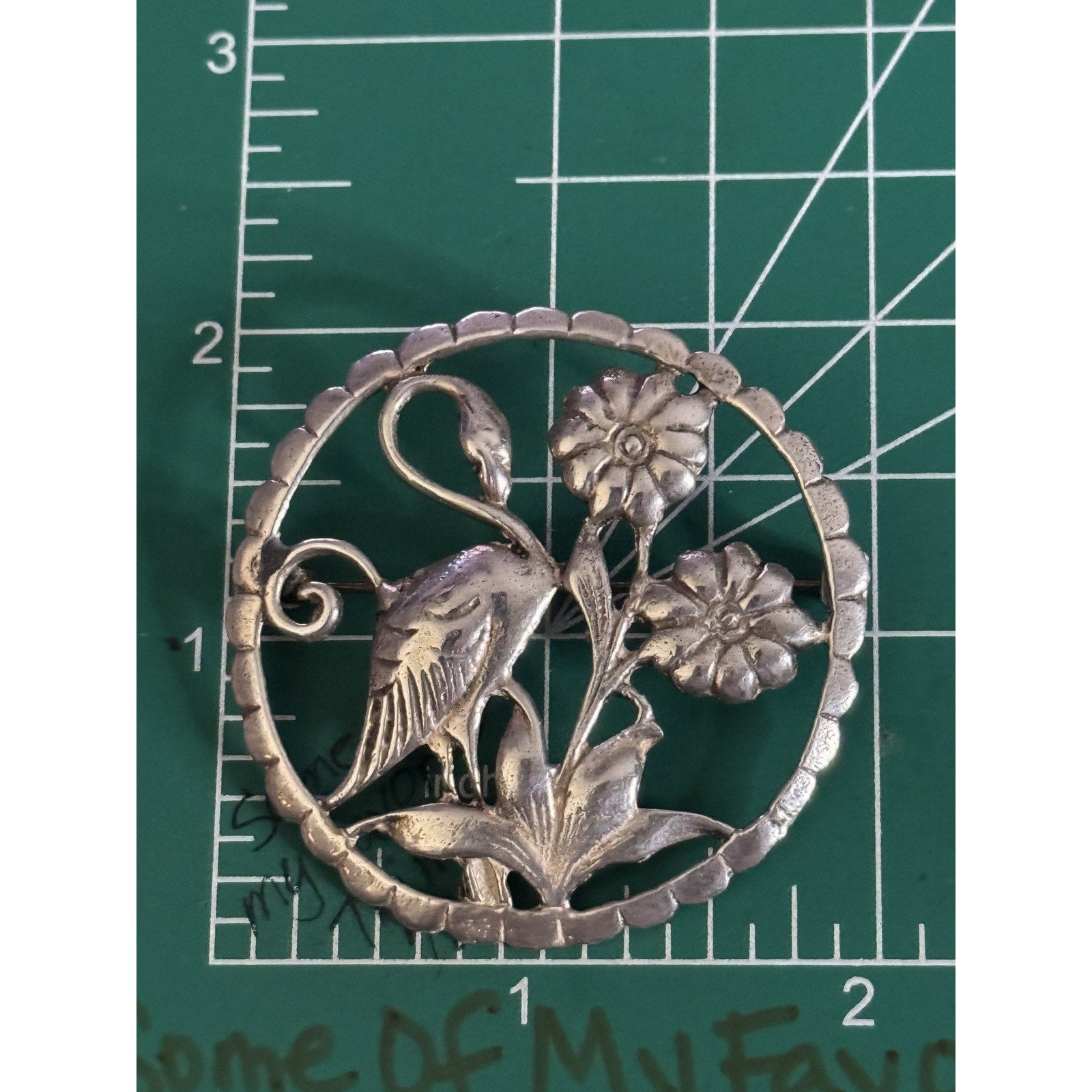 Beautiful vintage solid sterling silver brooch featuring an elegant long-necked bird surrounded by blooming flowers, crafted in a hand-cut openwork circular design with a scalloped border. The piece is stamped LMG, consistent with mid-century artisan silverwork.